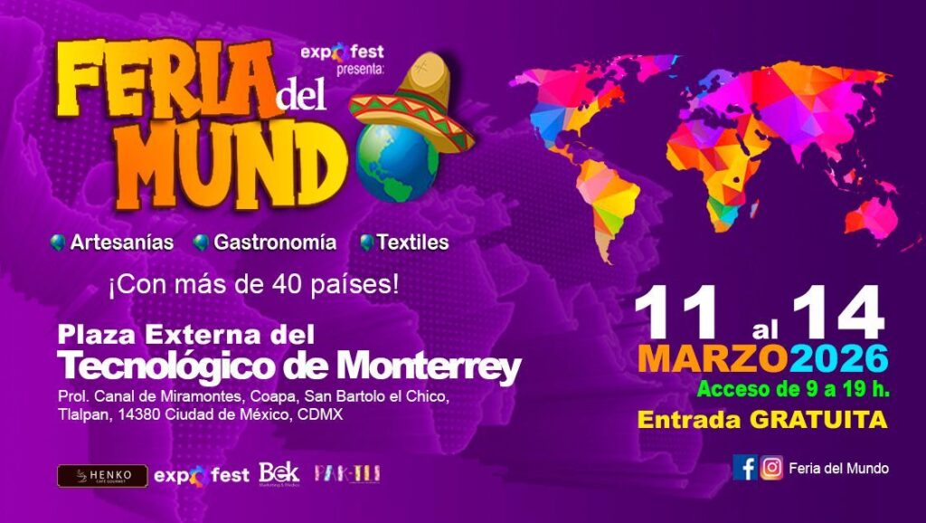 La FERIA DEL MUNDO reunirá a MÁS DE 40 PAÍSES del miércoles 11 al sábado 14 de marzo en la Plaza Externa del Tecnológico de Monterrey, Campus Ciudad de México, ubicada en Prolongación Canal de Miramontes, Coapa, San Bartolo el Chico, Tlalpan 14380, CDMX.